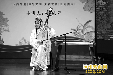有人说,到苏州必须做两件事:一、夜游平江路;二、到平江路伏羲琴馆看吕成芳的昆曲表演。11月3日,吕成芳来到鄞州区(大学园区)图书馆“明州讲堂”,作题为“大雅之音,江南美韵”的讲座(上图)。昆曲的文化传承、细腻的表演、优美的身段示范……生动、风趣、幽默的讲座博得了在场观众阵阵掌声。