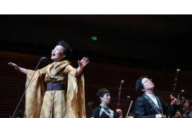 4月10日,在美国旧金山,歌手龚琳娜演唱民歌《小河淌水》。 由中国广播艺术团主办的2018魅力中国演出10日在旧金山举行。演出中包含中国戏曲、舞蹈、声乐等多种艺术形式,并通过管弦乐队与西洋美声唱法的融合、中国乐器与西洋乐器的对话,充分展现民族管弦乐的艺术魅力。新华