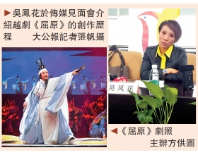 由中国戏剧奖曹禺剧本奖获得者吕育忠编剧、国家一级导演杨小青与国家一级演员于伟萍共同执导,绍兴小百花越剧团新编歷史越剧《屈原》今明(十一月十四及十五日)两晚七时十五分在上海大剧院公演。 在日前举行的媒体见面会上,该剧主演、中国戏剧梅花奖二度梅获得者吴凤花坦言