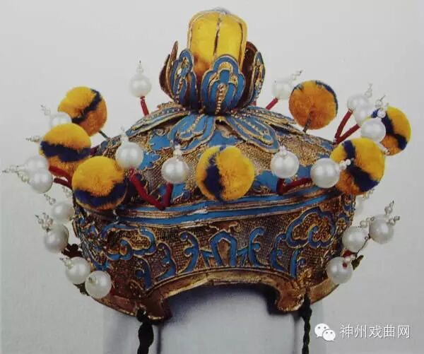 扎巾盔 为扎巾之进一步美化,大将戴,前扇大额子,后扇高突硬火焰,饰面牌、光珠、绒球、龙形耳子,分金银两种。如《古城会》中的蔡阳。