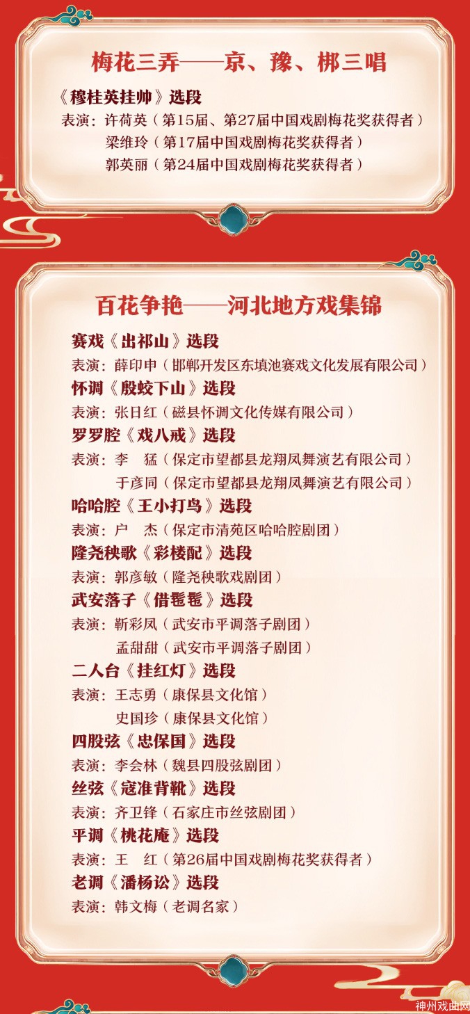 河北艺术职业学院戏剧系师生进入河北春节戏曲晚会剧组,参加了2024年河北春节戏曲晚会排练活动,与省内外31位中国戏曲梅花奖获得者和优秀青年戏曲演员同台演绎、共贺新春。今晚21:30,2024河北春节戏曲晚会在河北卫视准时播出——以下是晚会节目单,欢迎广大戏迷朋友收看!晚会还将于2月11日(大年初二)晚19:00在河北广播电视台农民频道再次播出,敬请期待!
